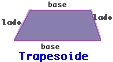 Trapesoide Un cuadrilatero es un trapesiode si y solamente si tiene exactemente un par de lados paralelos. Los lados paralelos de un trapesoide se llaman las bases. Los lados no paralelos se llaman lados laterales. Los angulos formados por las bases y los lados laterales se llaman bases angulares. El segmento linear que une los puntos medios de los lados laterales del trapesoide se llama la mediana. La altitud es el segmento perpendicular a las bases con los puntos extremos en las bases.